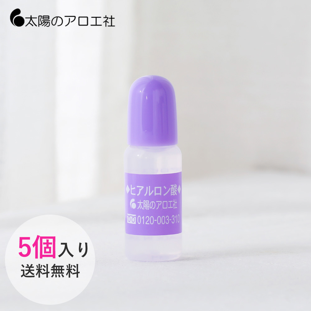 太陽のアロエ社 ヒアルロン酸 原液 10ml【5本セット】  口コミで評価の高いヒアルロン酸原液。 いつものケアにプラス使いで 憧れのぷるぷる肌に。 純国産の高純度ヒアルロン酸水溶液をそのまま容器につめました。水で薄めれば美容液としても使え、化粧水、クリームからシャンプーまでさまざまなスキンケア、ヘアケア製品にプラスするだけで、その製品の保湿効果を高められます。いつも使っている化粧品を変えずに頭からつま先までうるおい補給ができるコスメ原料です。