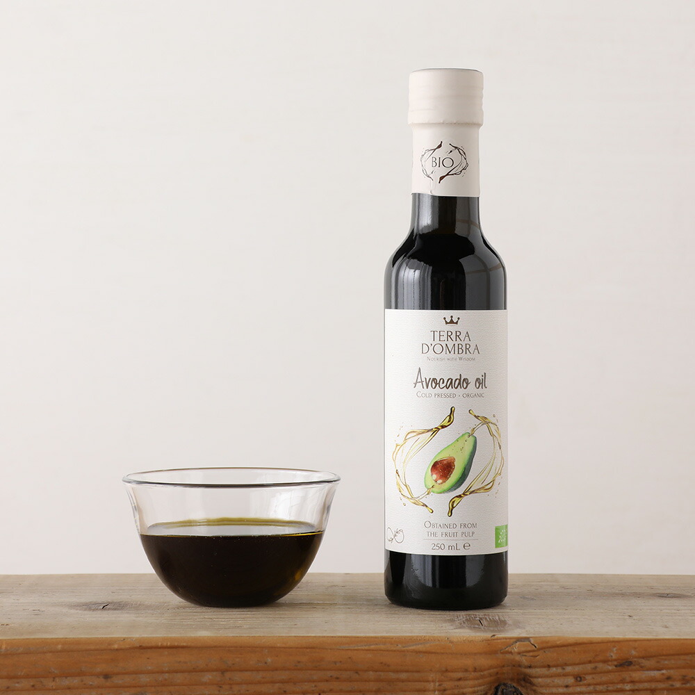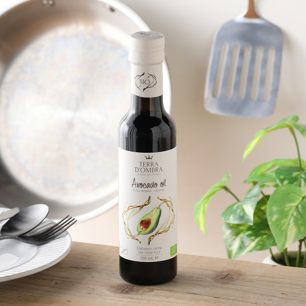 TERRA D'OMBRA(テラドンブラ) オーガニックアボカドオイル 229g(250ml)  加熱用にも生食用にも。 普段の食卓で使いやすいアボカドオイル。 「森のバター」と呼ばれ、ビタミンEが豊富な有機アボカドの果実を丁寧に低温圧搾しました。