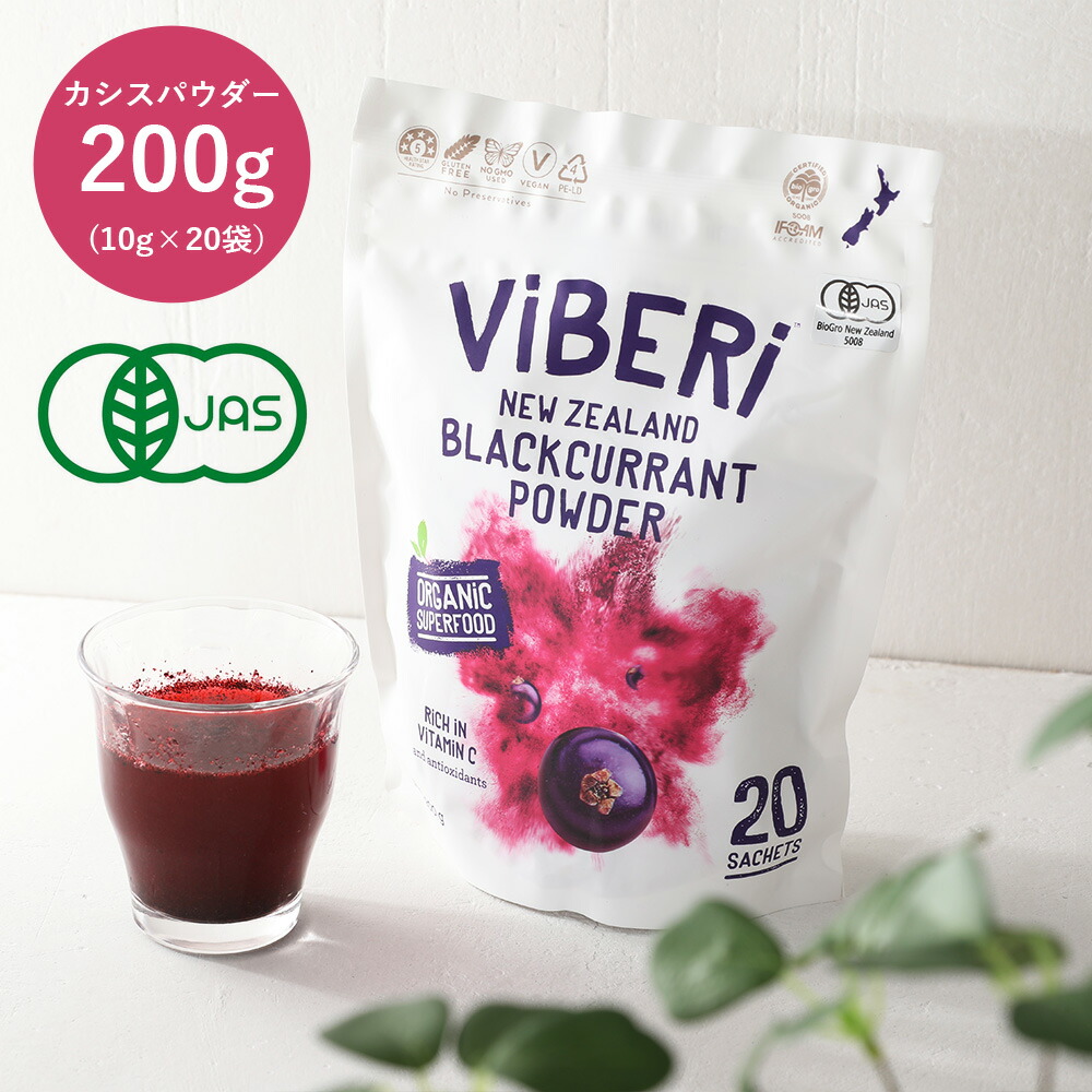 ViBERi(ヴァイベリー) 有機JASカシスパウダー 200g(10g×20袋)  パソコン・スマホをよく使う人を、内側からサポート! カシス丸ごとの栄養をそのままパウダーに。 ニュージーランドの南カンタベリー地方の豊かな土壌。 南アルプスから流れる清らかな水源。 大気汚染が少ないと言われる澄んだ空気。