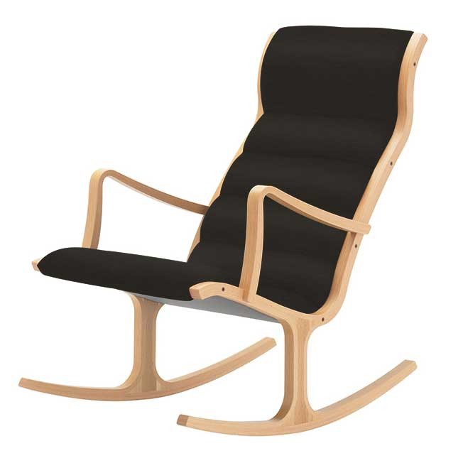 国産ロッキングチェアー グッドデザインにも選ばれた名作椅子です。菅沢 光政デザイン。 ゆったりした自然なロッキングのゆれが人気です。合成皮革張り 写真は張り生地ブラック色です。張生地は5色よりお選びいただけます。究極のシンプルです。安心安全の国産品です。届いてすぐに使えるうれしい完成品