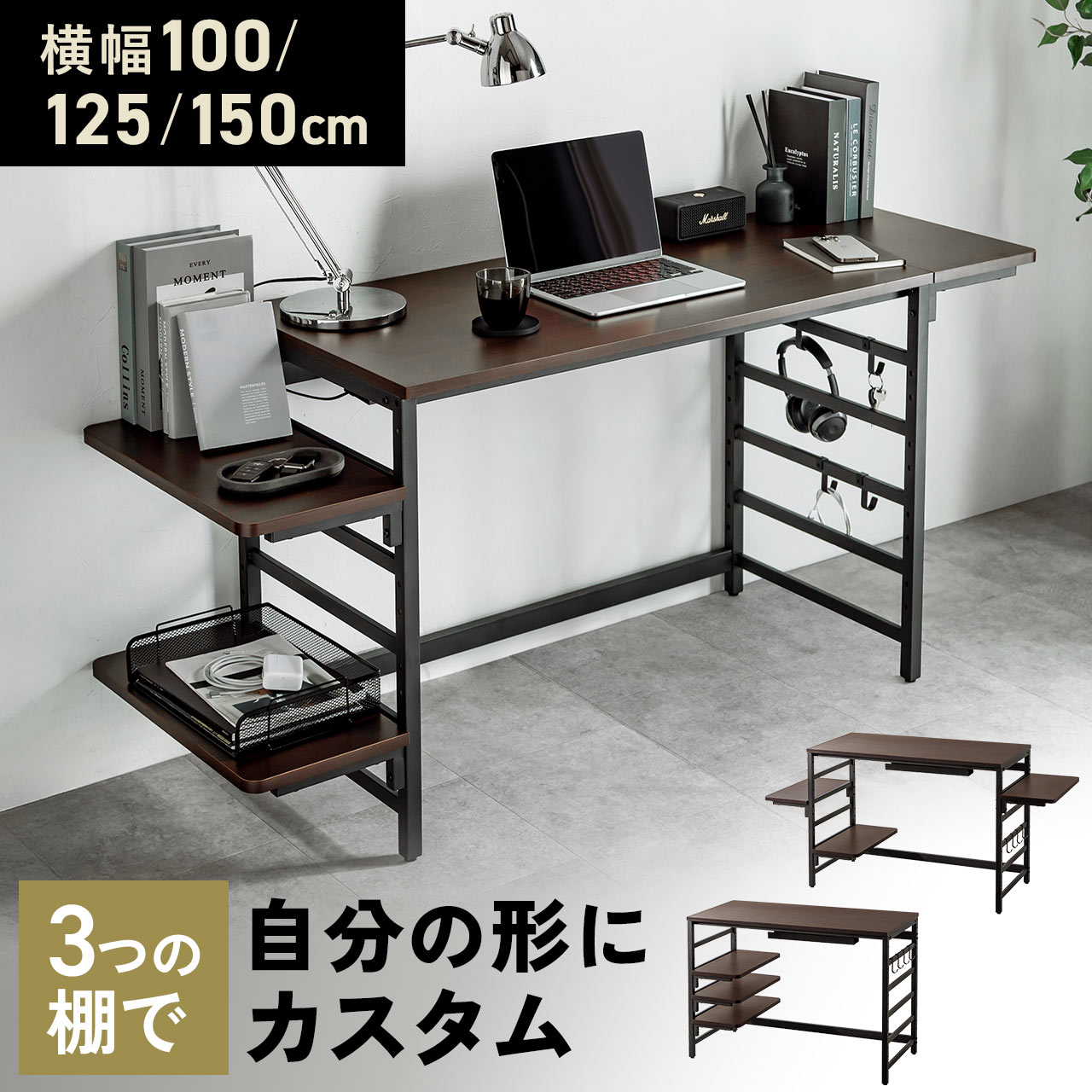 3枚の棚板を自由に取り付けができるシェルフデスク。合計18箇所から3箇所選び棚板を設置できるため、使用用途によって自由にレイアウトを決めることができる【WEB限定商品】