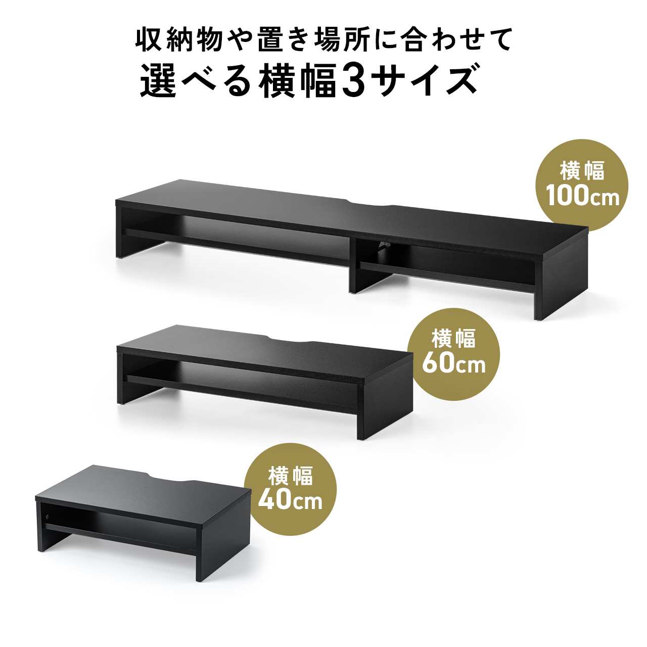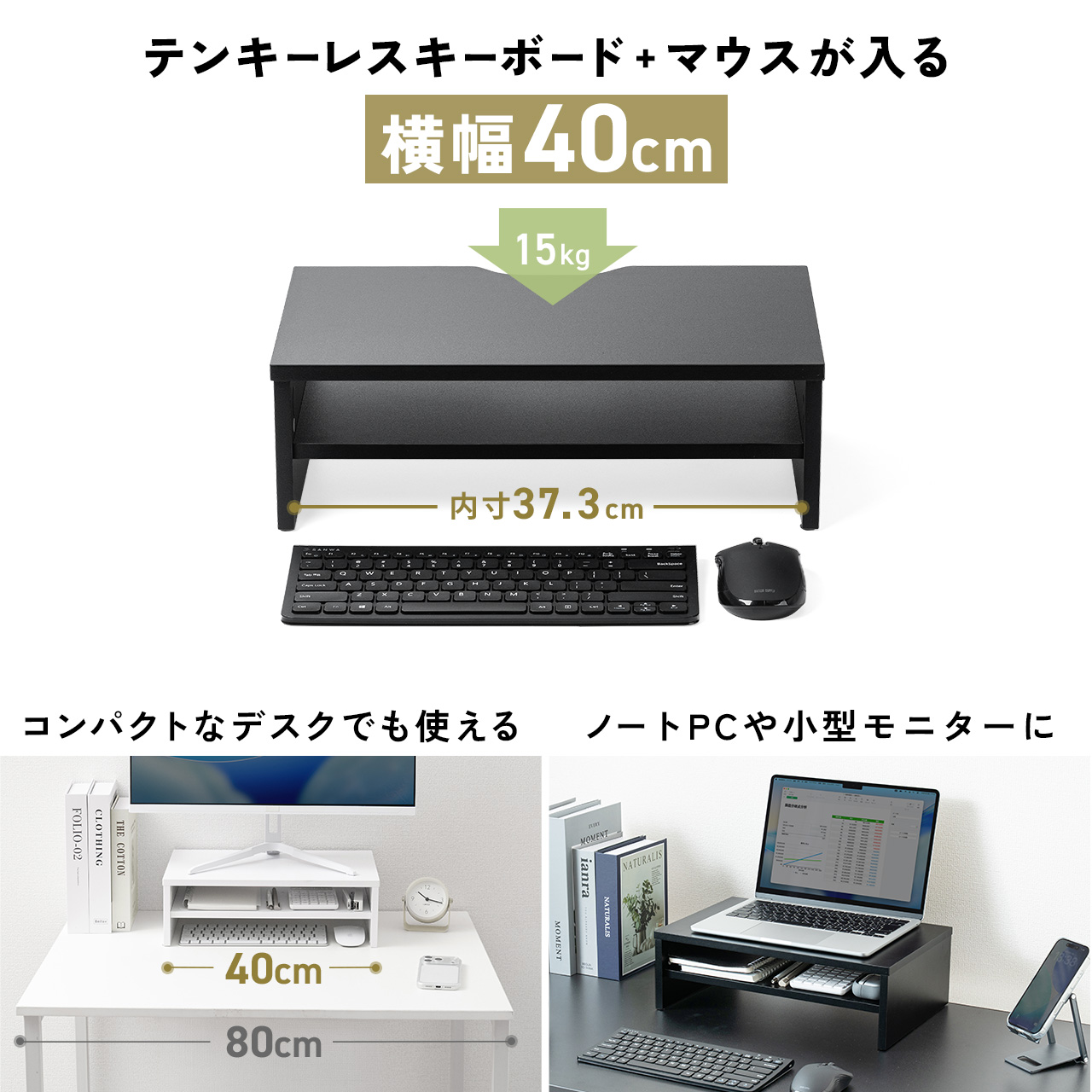 モニターを設置して、机の上を整理できる2段式モニター台。モニター下にキーボードを収納してスペースを有効活用できる。パソコン台、プリンター台、テレビ台、電話台としても使用できる木製の机上台。幅40cm、奥行き25cm。ブラック。【WEB限定商品】