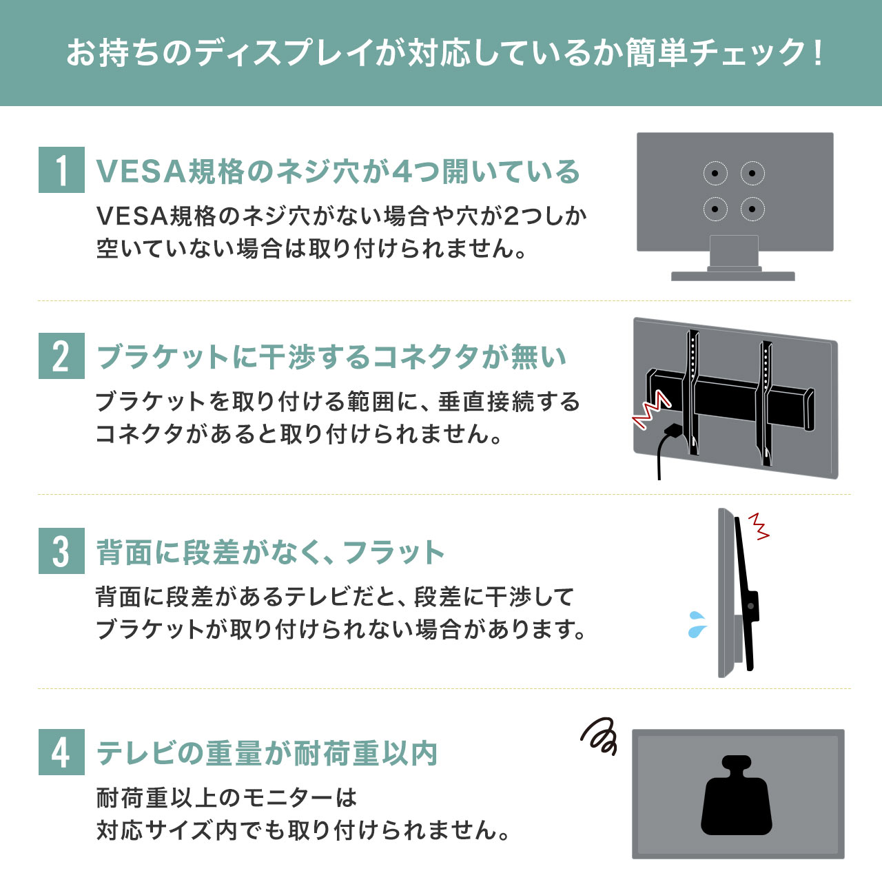 ※対応VESAでも、テレビ背面に設置ブラケットに干渉する段差がある場合は、設置不可の場合がございます。