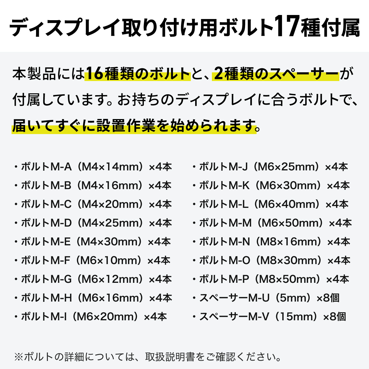ディスプレイ取付けネジ×各4本(M5×14、M6×14、M6×30、M8×30、M8×50)、ワッシャー×4、