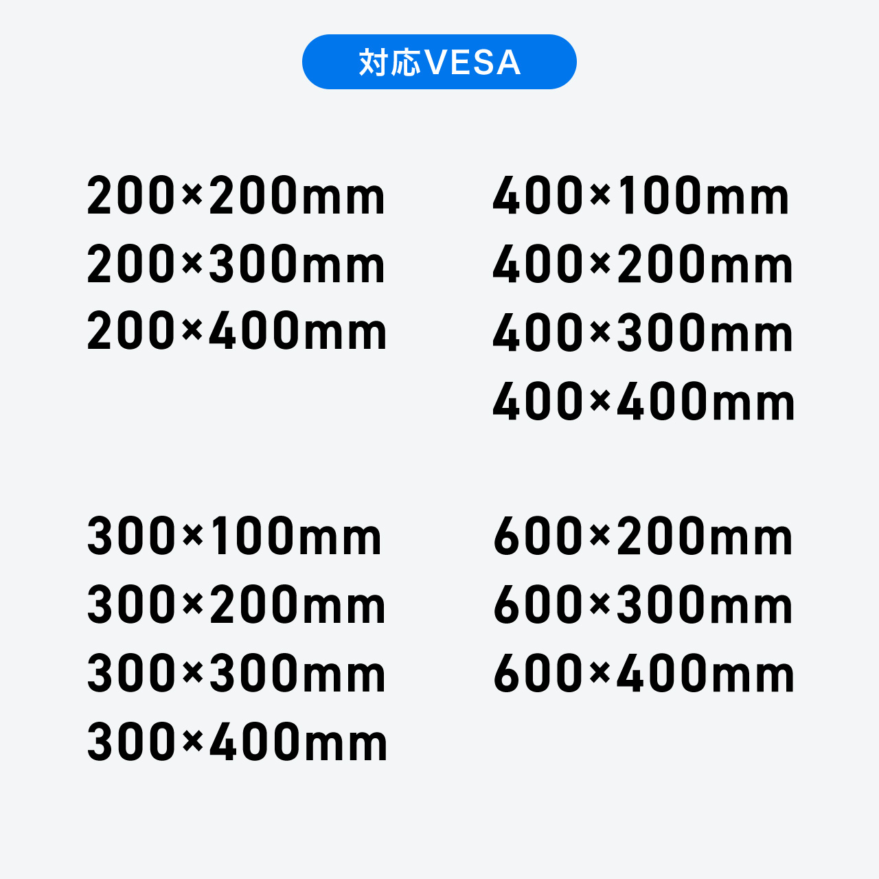■対応VESA:200×200、200×300、200×400、300×100、300×200、300×300、300×400、400×100、400×200、400×300、400×400、600×200、600×300、600×400、800×400、800×600