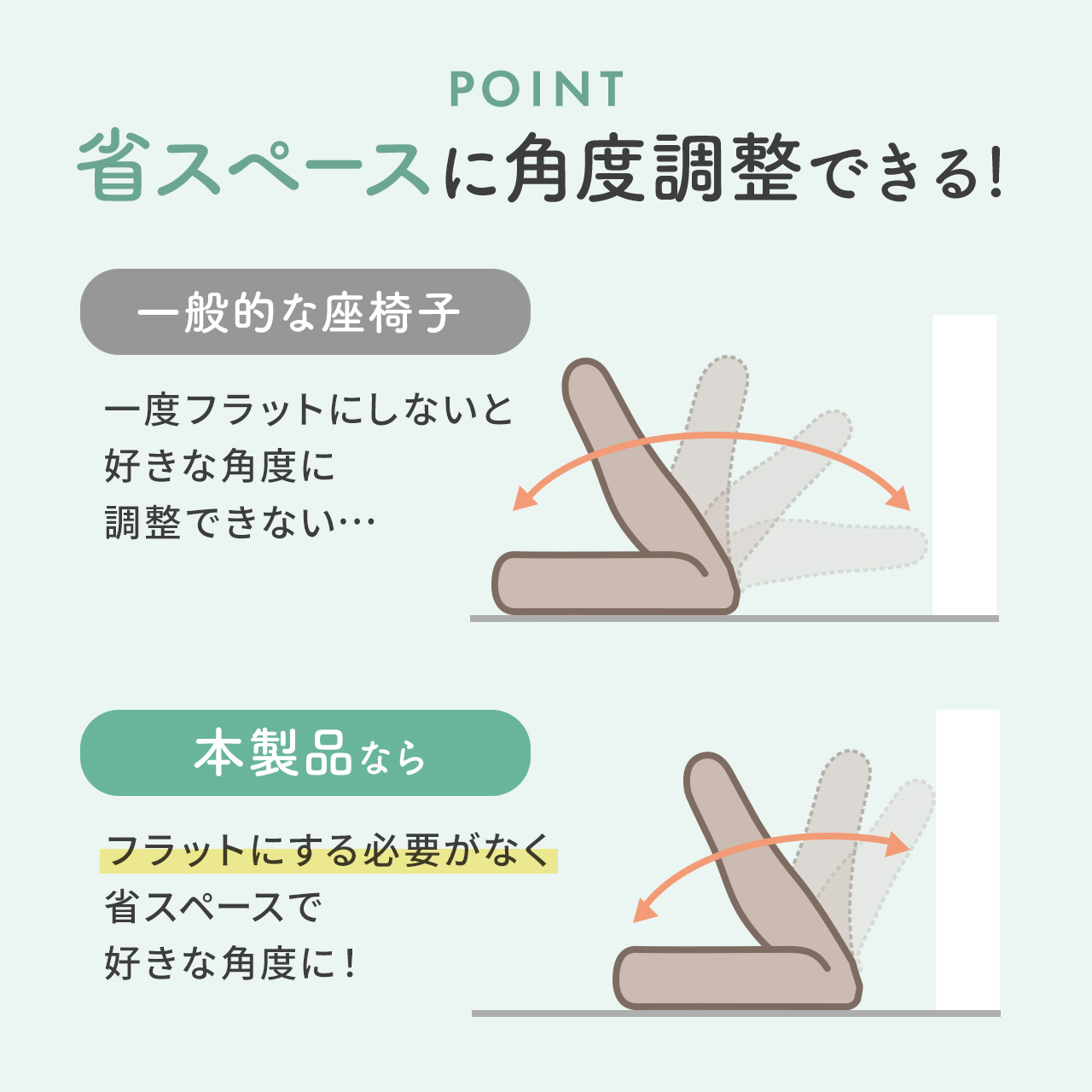 ・背もたれを42段階で好きな角度にリクライニングできる