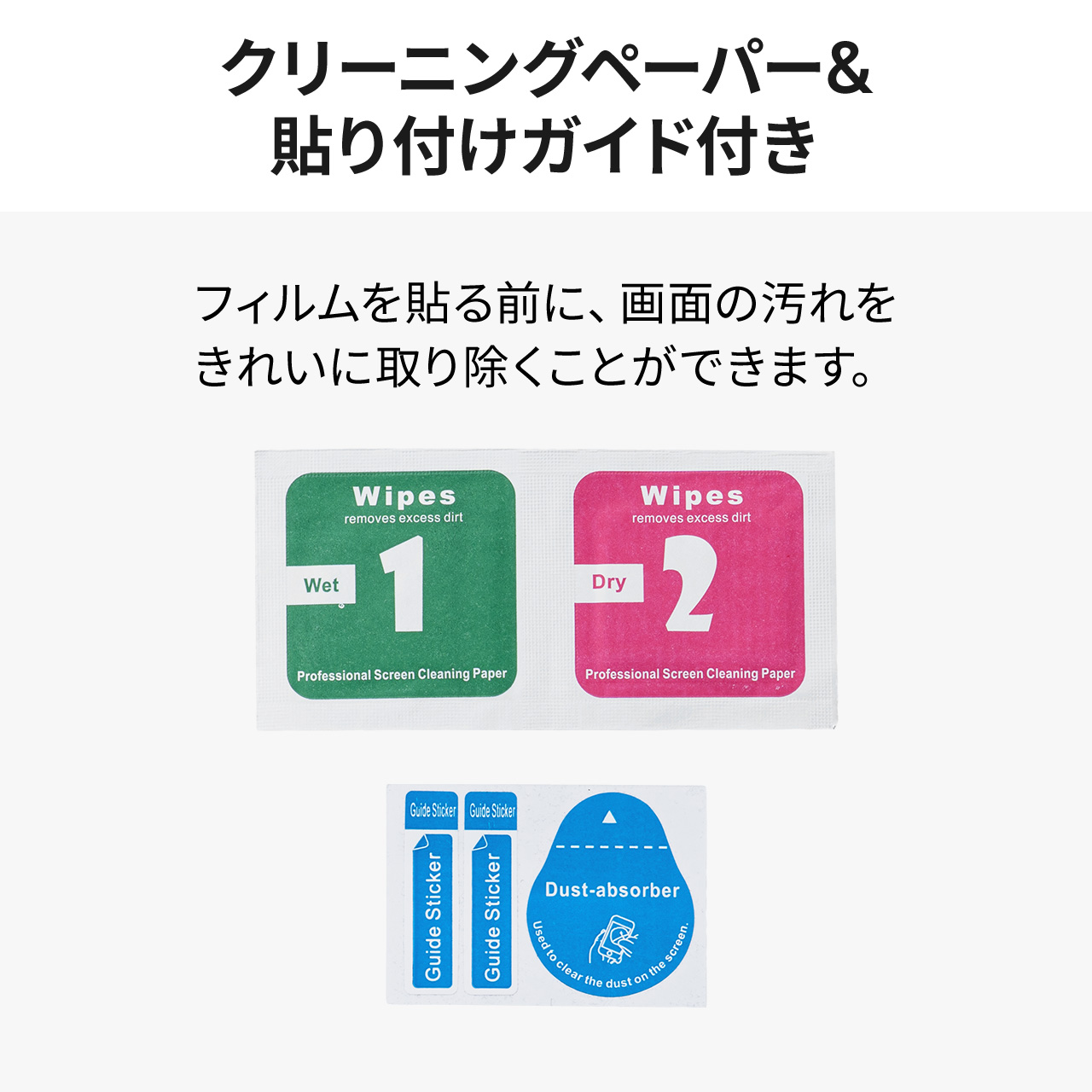 ・硬度9Hのガラスフィルム、指紋を拭き取れるクリーニングクロス付き