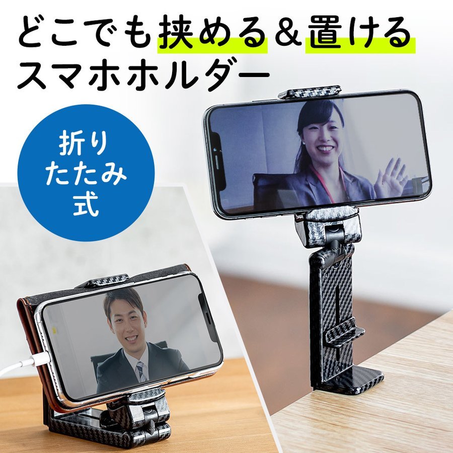 スマホホルダー スマホスタンド トラベルスマホホルダー 卓上 クランプ 折りたたみ コンパクト 自撮り棒 カーボン調 iPhone 新幹線 旅行 200-STN044CB