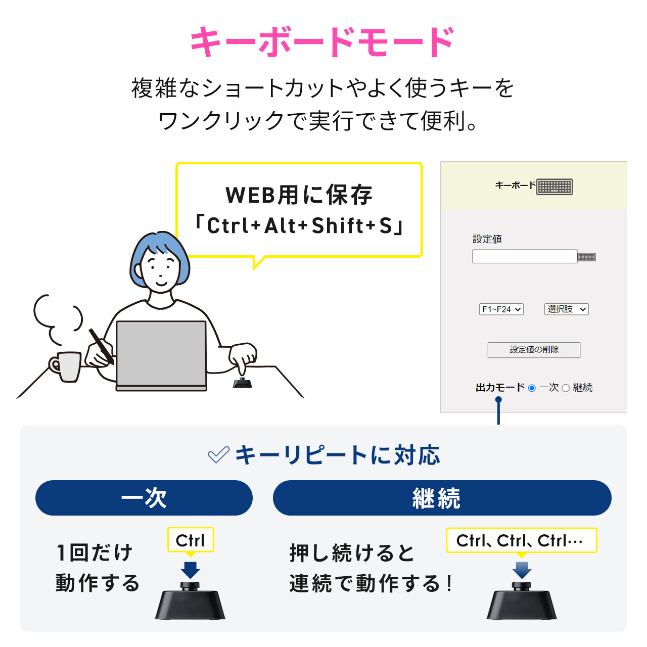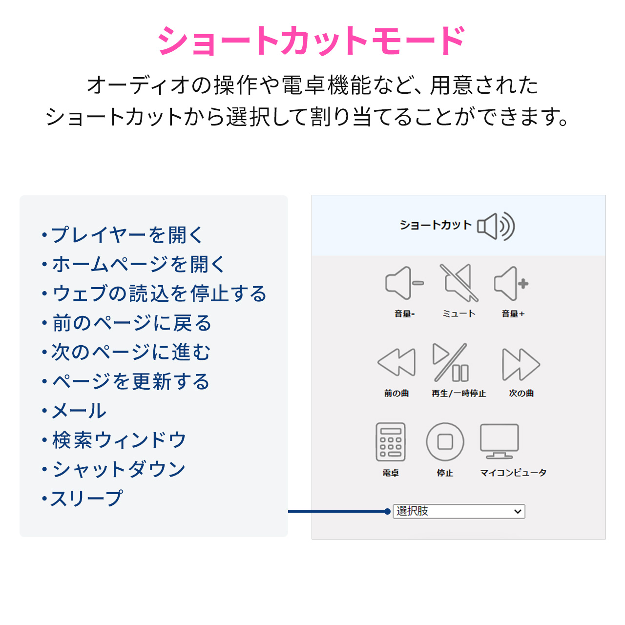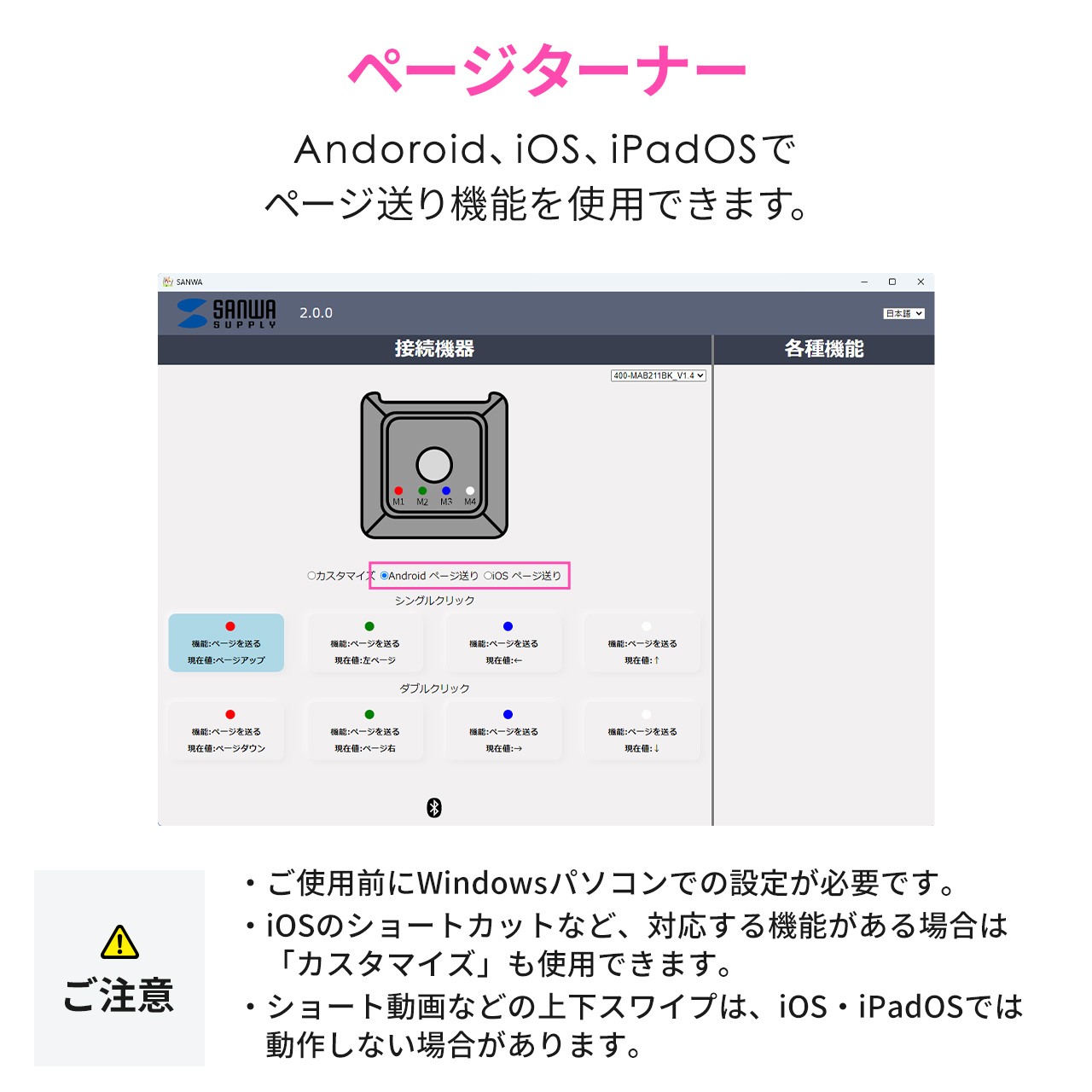 1つのボタンに最大8つの機能を割り当てることができるBluetoothプログラマブルボタン。プログラマブルボタン/ページターナー(楽譜ページめくり)の2WAYで使えるマルチメディアコントローラー。楽譜/電子書籍のページ送り、TikTokなどのShort動画のページ送り、プレゼンの際のパワーポイント操作に使える。キーのショートカット(複数キー同時押し)や文字列を割り当て可能。【WEB限定商品】
