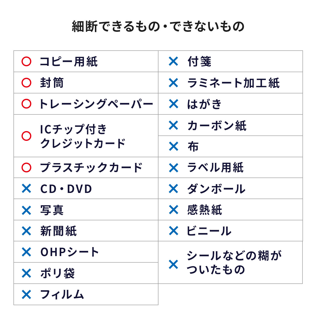 ※はがき等の厚みのあるもの、切手やシールなどの粘着性のあるものは目詰まりの原因となるものは絶対に細断しないでください。