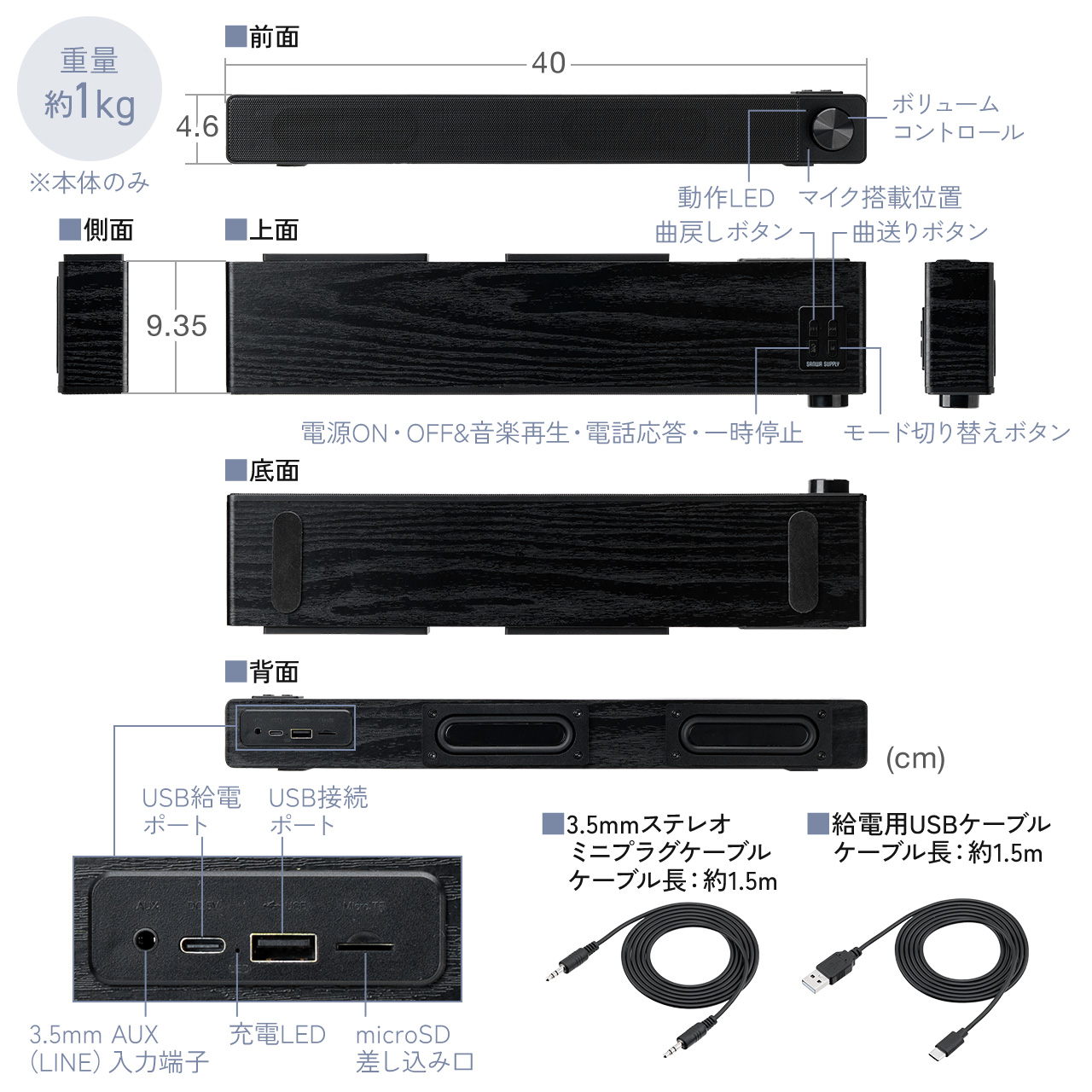 ■付属品:3.5mmステレオミニジャックケーブル(約1.5m)×1、給電用USBケーブル(約1.5m)×1、取扱説明書