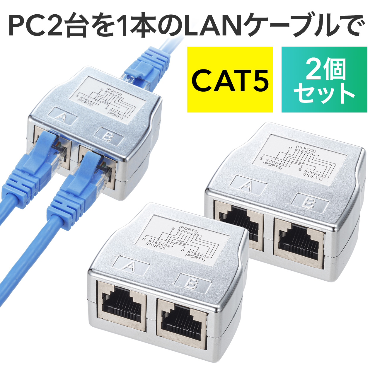 LANケーブル 延長 コネクタ 2分岐 分岐コネクタ アダプタ ケーブル分岐 中継 二股 RJ45 CAT5 カテゴリ5 カテ5 配線 1台では使用不可 2個セット 500-LAN2EX5-1-2