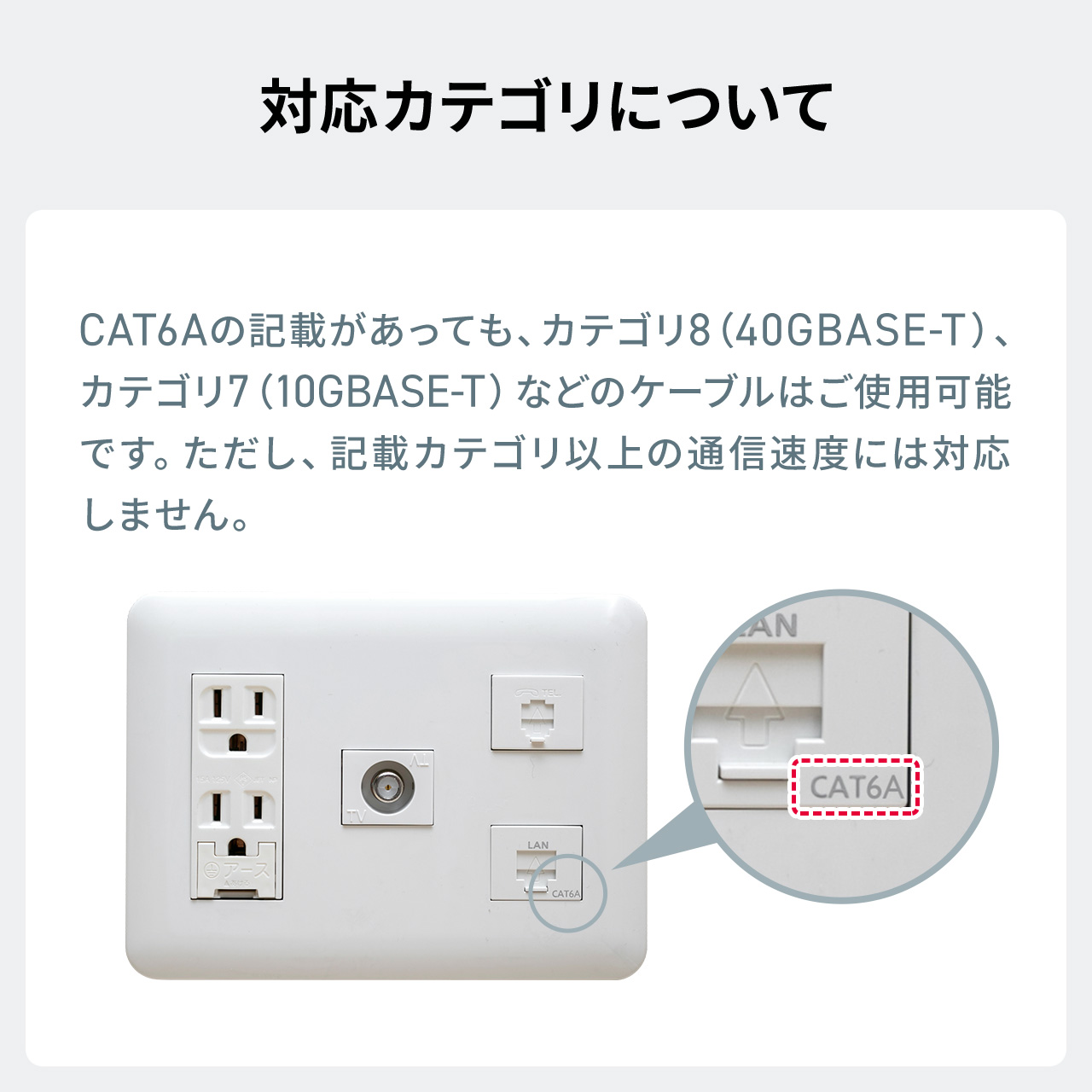■対応伝送帯域:カテゴリ6A(10GBASE-TX)、エンハンスドカテゴリ5(1000BASE-T)、カテゴリ5(100BASE-TX)、カテゴリ3(10BASE-T)適合