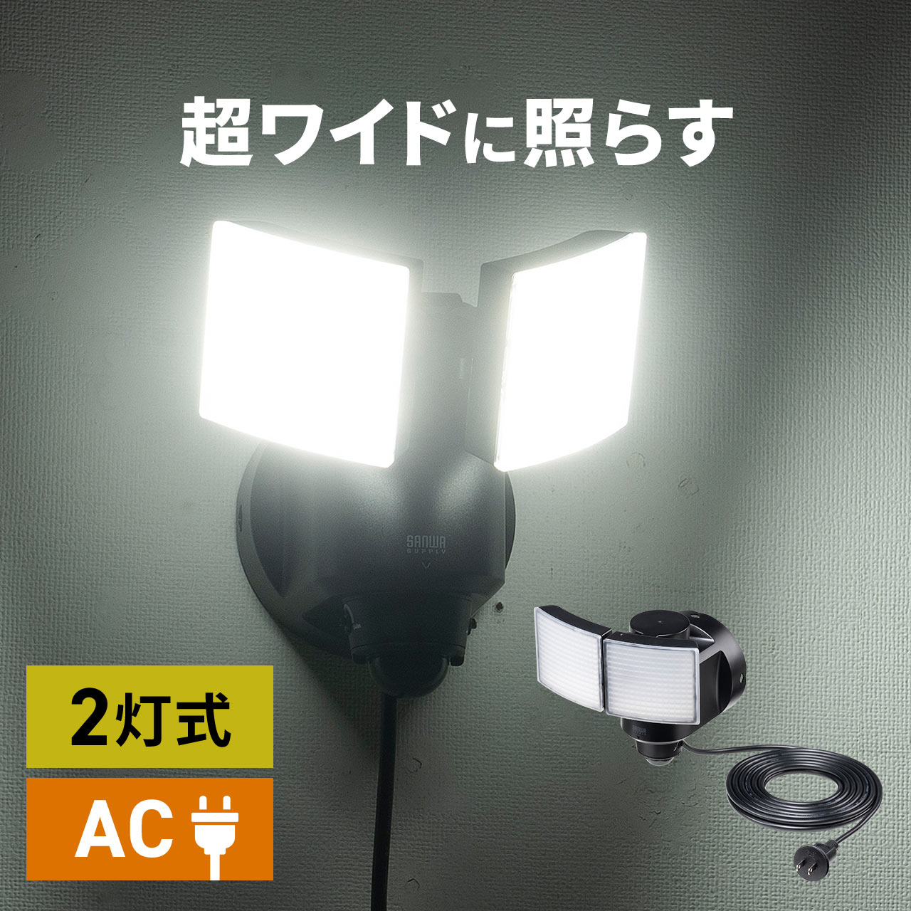 センサーライト 屋外 LED 玄関 防犯 駐車場 コンセント 防水 2灯 5m 人感センサー 100V 角度調整 明るい 1200ルーメン 800-LED086BK