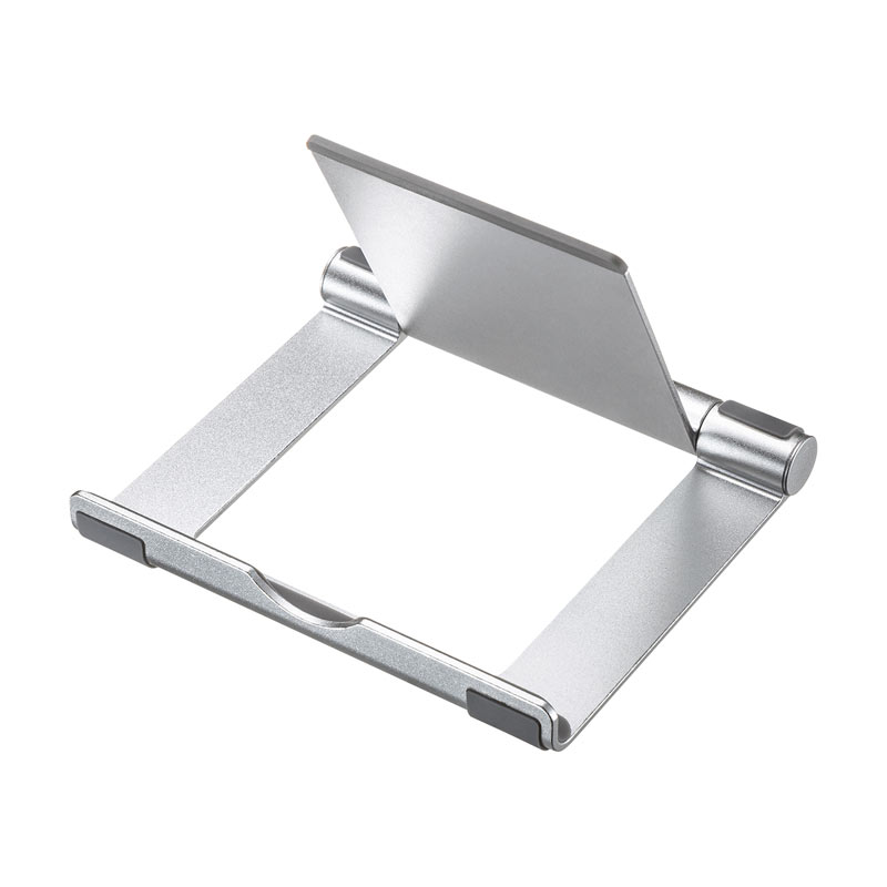 角度を無段階で調整できて持ち運びに便利な薄型、軽量のタブレット用アルミスタンド。