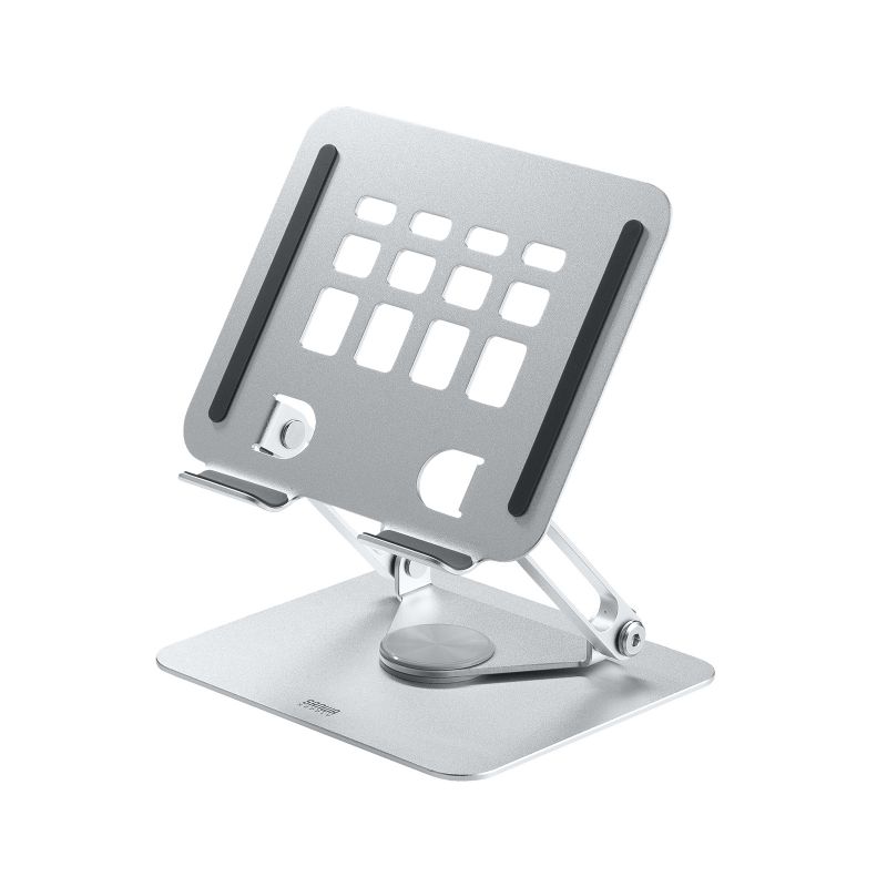台座部分が360°回転するアルミ製のタブレットスタンド。2つのヒンジを搭載し、前後の位置調整と左右の向きを変えることが可能。