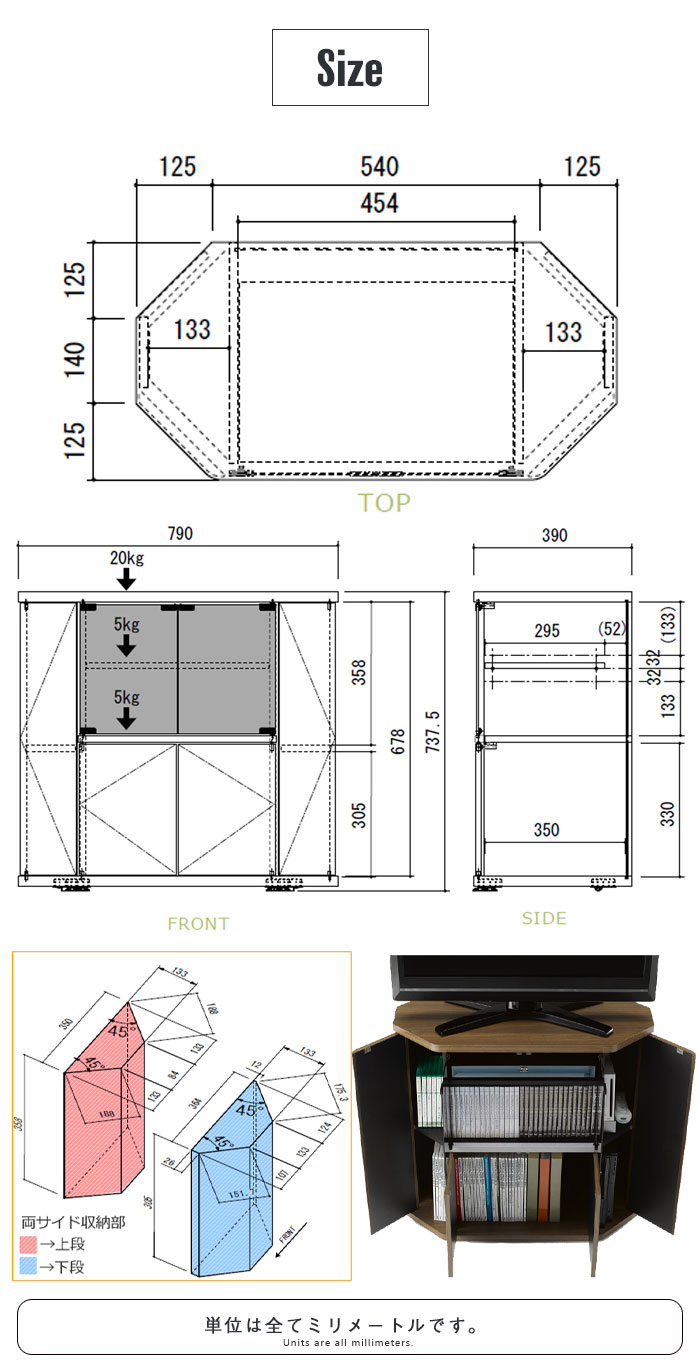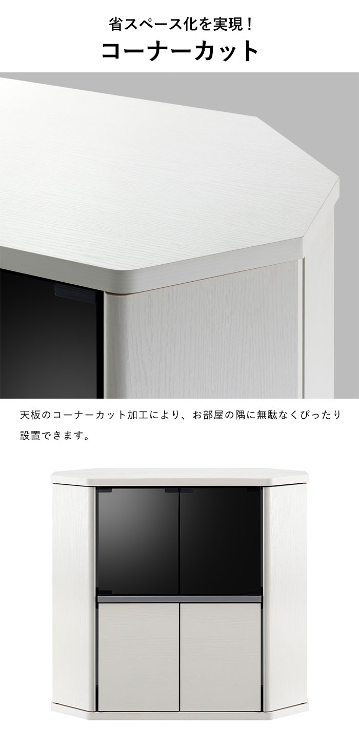| ・ コーナー使用可能の大型TV対応モデル ・ コーナー置き、平面置き、斜め置き、大型TVを設置した際のTVの方向を考慮した形状 ・ スマートキャスター付きで移動もラクラク ・ A4ファイル対応 ・ 左右の収納スペースは人気ゲーム機縦置き収納可能 ※収納できないゲーム機もございます。サイズをよくご確認願います。 |