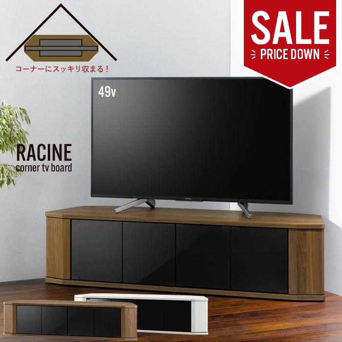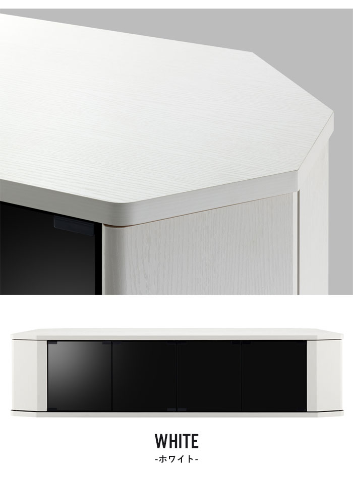 | コーナー使用可能な大型テレビ対応テレビ台。 天板のコーナーカット加工によりお部屋の隅に無駄なくピッタリ設置できます。 平面置き、コーナー置き、斜め置き、大型テレビを設置した際のテレビの方向を考慮した形状になっています。 テレビ周りをスッキリまとめる収納スペース。 デッキ類はもちろん、縦型収納部にはルーターやゲーム機など高さのあるモノの収納におすすめです。(※A4ファイル対応)(※収納できないゲーム機もございます。サイズをよくご確認ください。) 背面には配線用開口部があり、配線もスムーズ。(薄板に切り込みが入っています。) コード穴をあけずに使用することもできます。 正面から見えにくいスマートキャスター付きで移動もスムーズ。 落ち着いた質感のあるウォールナット木目のブラウンとモダンな印象の少し艶のあるPVCシートの白木目のホワイトの2色よりお選びいただけます。 |