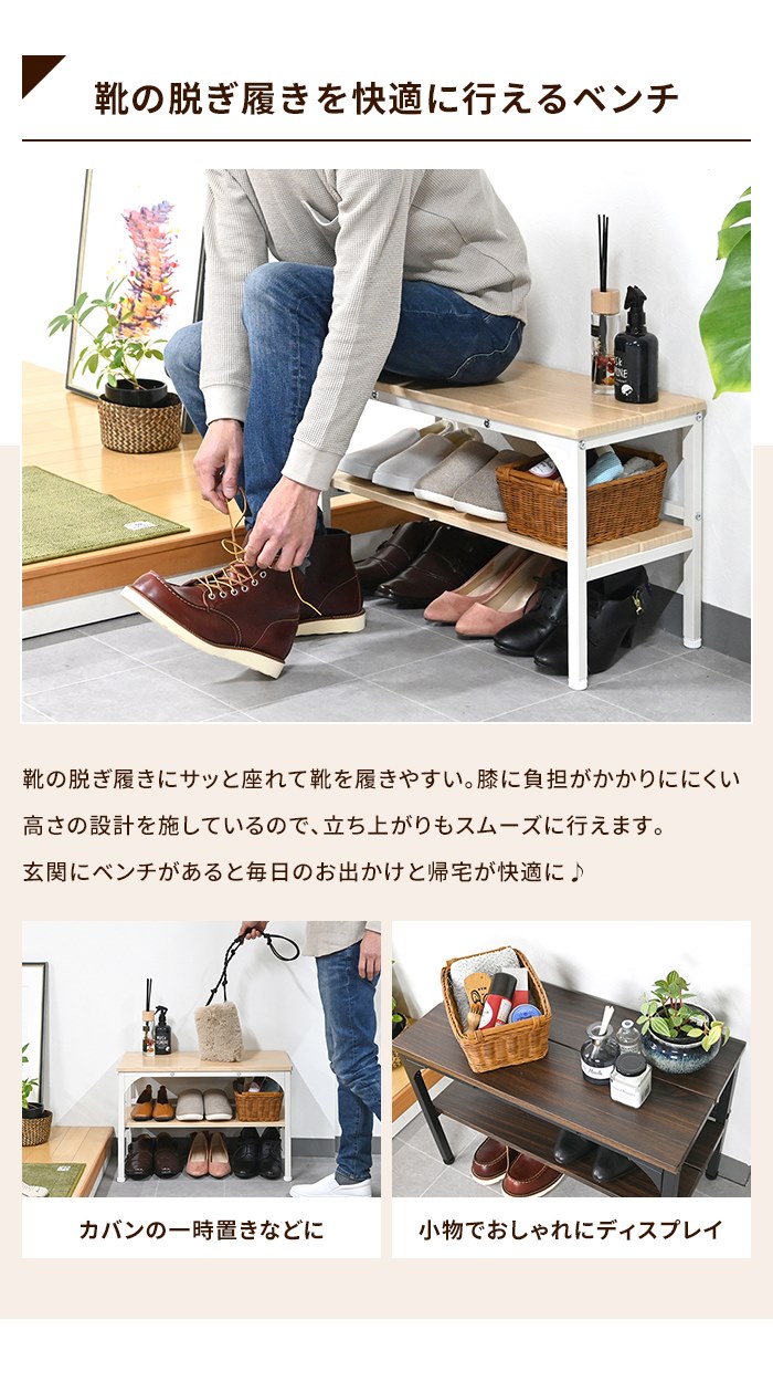 | 靴の脱ぎ履きにサッと座れて靴を履きやすく、立ち上がりもスムーズに。 ベンチがあれば、ロングブーツもらくらく。 お出かけ前や帰宅時に、鞄などの一時置きスペースとしても便利です。 |