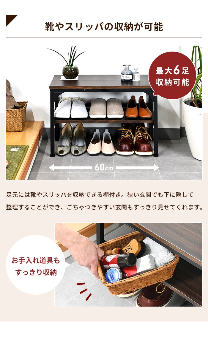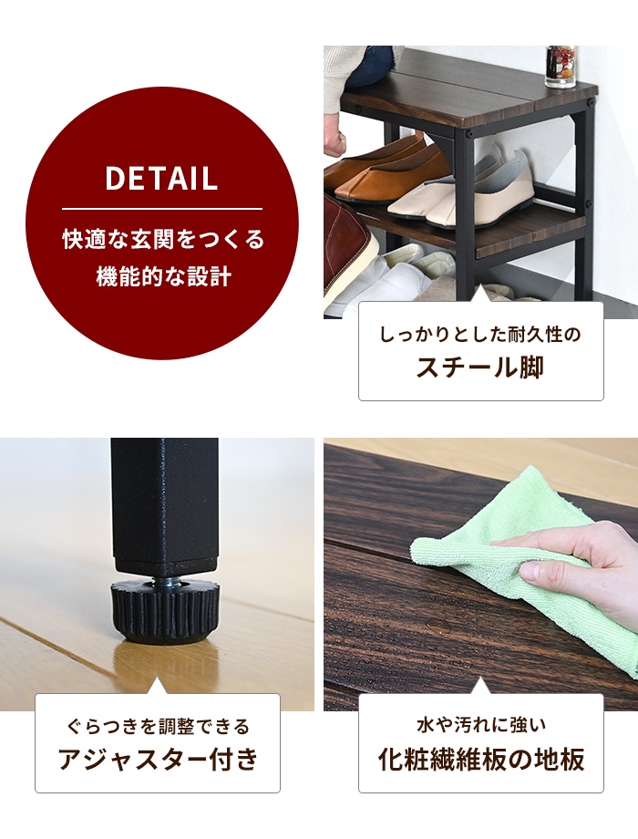 | ・膝に負担がかかりににくい高さの設計を施しています。 ・場所を選ばないスリム設計なので、玄関がすっきり整います。 ・ベンチ下の2段の収納スペースには、最大6足の靴が収納できます。 ・棚板は取り外すことができるので、ハイカットブーツなど高さのある靴も収納できます。 ・アジャスター付きで、勾配のある玄関でも水平に設置できます。 |