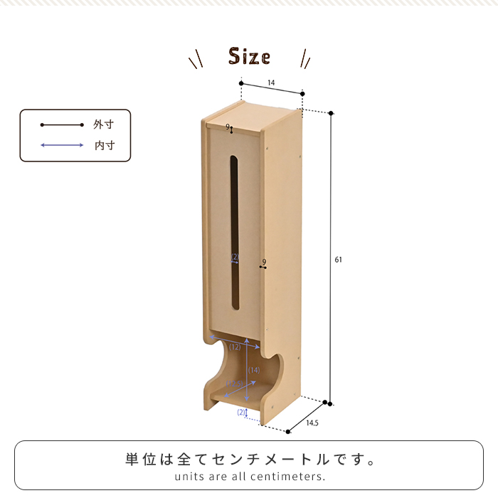 | ・トイレットペーパーを隠してすっきり収納。 ・トイレットペーパー最大6個収納OK。 ・上部は片開きの蓋で、上から簡単に補充可能。 ・スリットから残数を一目で確認できる。 ・奥行14.5cm×幅14cmのスリムでコンパクトな設計。 ・ナチュラルな木目調でトイレ空間に馴染みやすいデザイン。 |