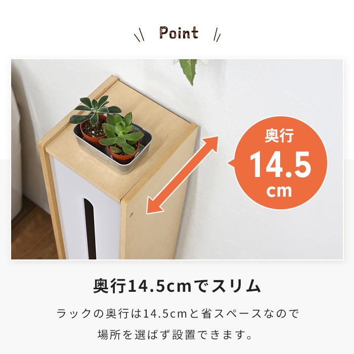 | トイレットペーパーをすっきり隠して収納できる、スリムなトイレラック。 生活感が出やすいストックをスマートに収納し、トイレ空間をすっきりと整えるます。 上部は片開きの蓋になっており、トイレットペーパーを上から簡単に補充できる仕様。 スリットデザインにより、外から残数を確認できる使いやすさも魅力。 最大6個まで収納OK。 奥行14.5cm・幅14cmのコンパクト設計で、限られたスペースにも置きやすいサイズ。 ナチュラルな木目調デザインが空間にやさしく馴染み、トイレを爽やかな印象に演出します。 |