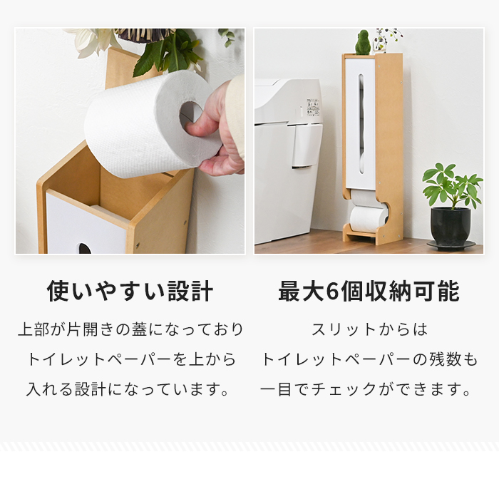 | ・トイレットペーパーを隠してすっきり収納。 ・トイレットペーパー最大6個収納OK。 ・上部は片開きの蓋で、上から簡単に補充可能。 ・スリットから残数を一目で確認できる。 ・奥行14.5cm×幅14cmのスリムでコンパクトな設計。 ・ナチュラルな木目調でトイレ空間に馴染みやすいデザイン。 |
