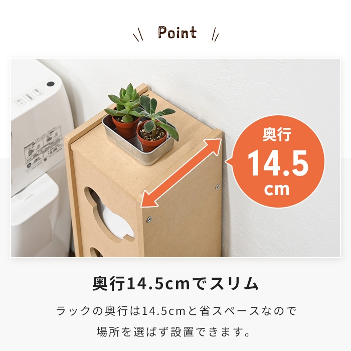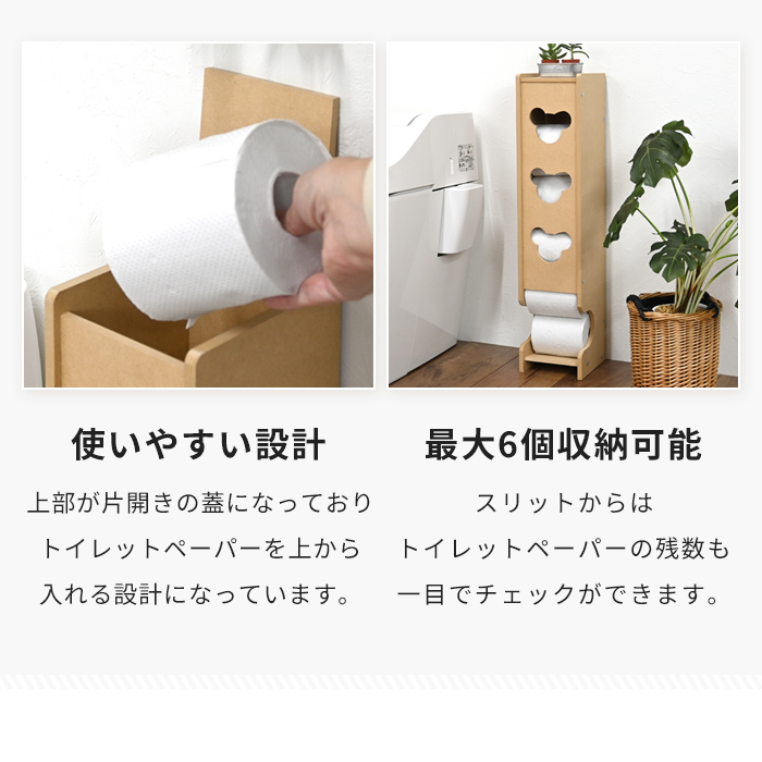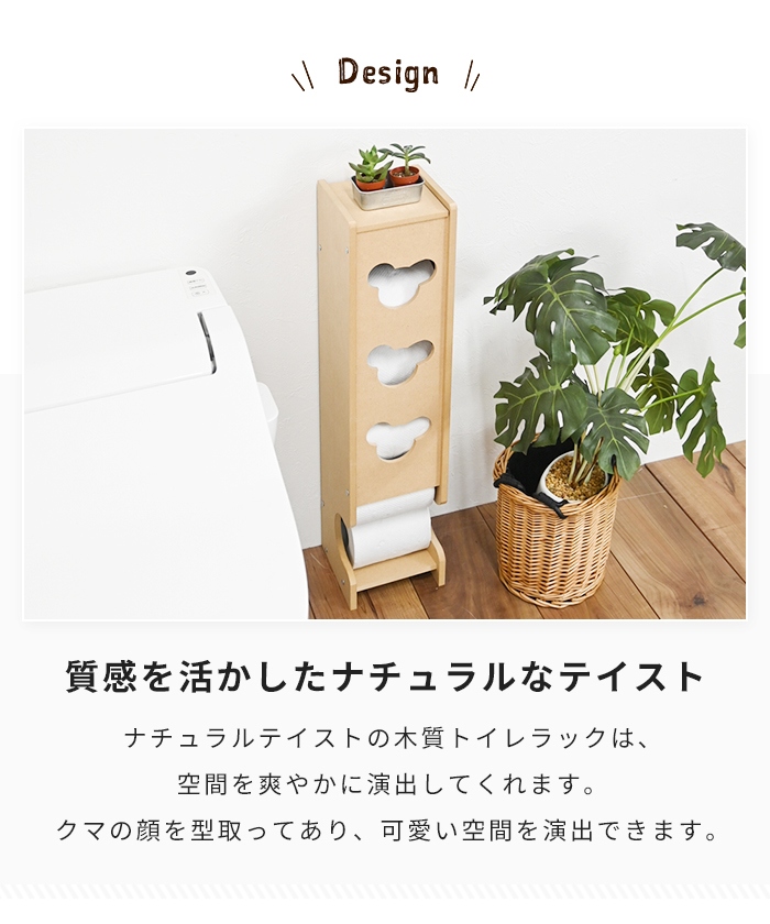 | 生活感が出やすいトイレットペーパーを、すっきり隠して収納できるトイレラック。 上部は片開きのフタ仕様になっており、トイレットペーパーを上から簡単に補充でき、最大6個まで収納可能。 トイレットペーパー収納部にはクマの顔をモチーフにしたデザインが施されており、かわいらしくやさしい雰囲気のトイレ空間を演出します。 幅14cm・奥行14.5cmのスリム設計なので、狭いトイレでも場所を取らず設置できます。 ナチュラルテイストの木質デザインで、トイレ空間を明るく爽やかに演出します。 |