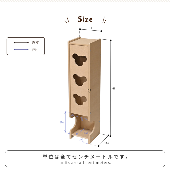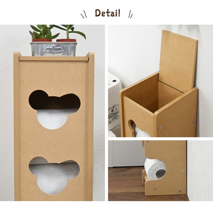 | ・トイレットペーパー最大6個収納 ・クマの顔をモチーフにしたかわいいデザイン ・上から補充できる片開きフタ仕様 ・幅14cm 奥行14.5cmのスリム設計 ・省スペースでトイレに設置可能 ・ナチュラルな木質デザイン |