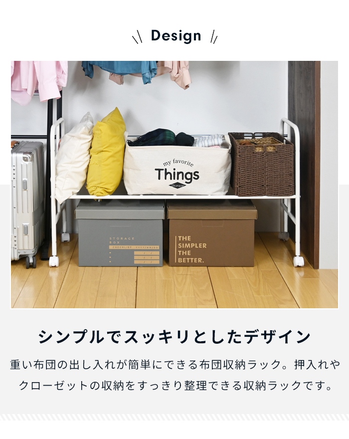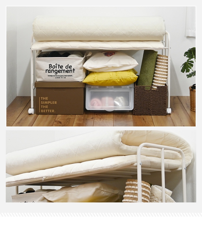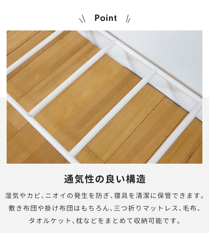 | 重い布団の出し入れが簡単にできる布団収納ラック。 敷き布団や掛け布団はもちろん、三つ折りマットレス、毛布、タオルケット、枕などをまとめて収納可能。 通気性の良い構造で湿気やカビ、ニオイの発生を防ぎ、寝具を清潔に保管できます。 棚位置を調整できるので、布団以外の収納にも対応。 キャスター付きで移動もスムーズ。掃除の際やレイアウト変更にも便利。 押入れやクローゼットの収納をすっきり整理できる収納ラックです。 |