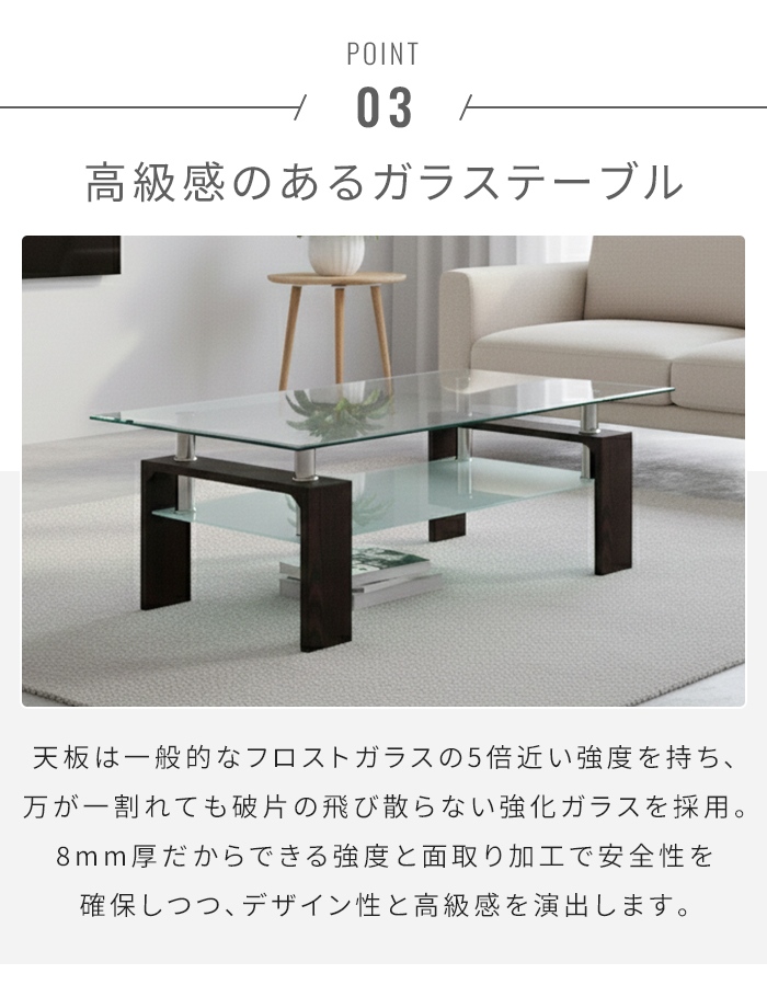 | □ ソファ [芯材]合板・天然木 [肘]天然木 [クッション材]ウレタンフォーム [張り地](背・座)ポリエステル・綿 □ テーブル [天板/棚板]厚さ8mm/厚さ6mm強化ガラス、(天板)透明ガラス、(棚板)ミストガラス [脚]MDF 強化紙張り 支柱φ50 |