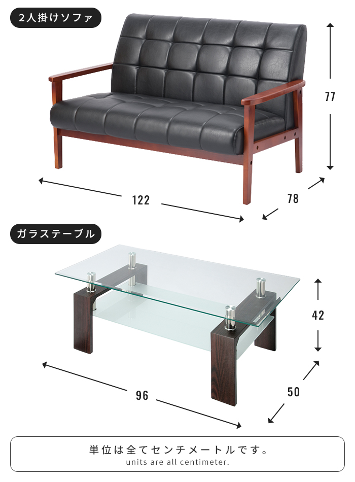 | [一人掛けソファ]幅65×奥行78×高さ77cm [二人掛けソファ]幅122×奥行78×高さ77cm [テーブル]幅96×奥行50×高さ42cm |