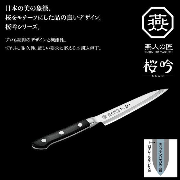 日本の美の象徴、桜をモチーフにした桜吟シリーズのペティナイフ。プロも納得のデザインと機能性。切れ味、耐久性、厳しい要求にこたえる本割込包丁。ペティナイフには桜柄のログ印刷入り。