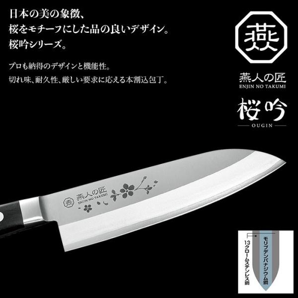 日本の美の象徴、桜をモチーフにした桜吟シリーズの三徳包丁。プロも納得のデザインと機能性。切れ味、耐久性、厳しい要求にこたえる本割込包丁。包丁には桜柄のログ印刷入り。