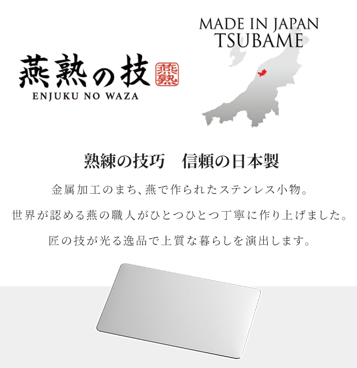 | 【燕熟の技】 ● ステンレスカードケース ● ステンレスカードケース・和柄 ● ステンレスカードミラー ● 本革印鑑マット ● 箸置き・ナイフレスト2P ※このページは[燕熟の技 ステンレスカードミラー]を販売しております。 |