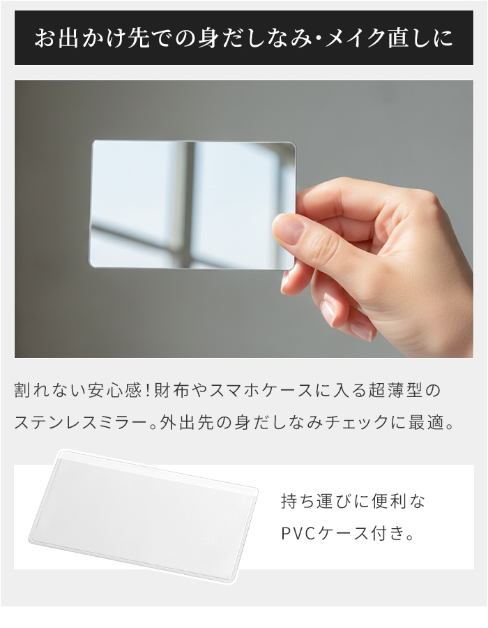 | 熟練の技巧と確かな品質を誇る、日本製ステンレスカードミラー。 金属加工のまち・燕で丁寧に作られた、ステンレス製の薄型カードミラーです。 カードケースと同等サイズのため、財布や名刺入れ、ポーチなどにすっきり収納可能。 外出先やビジネスシーン、旅行時の身だしなみチェックにさっと使えます。 シンプルで上質なデザインは、男女問わず使いやすく、日常使いに適した実用的なアイテムです。 |