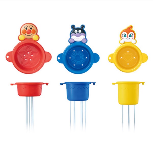 アンパンマンカップ、ばいきんまんカップ、ドキンちゃんカップそれぞれ水の出方が異なるシャワーカップのセットです。