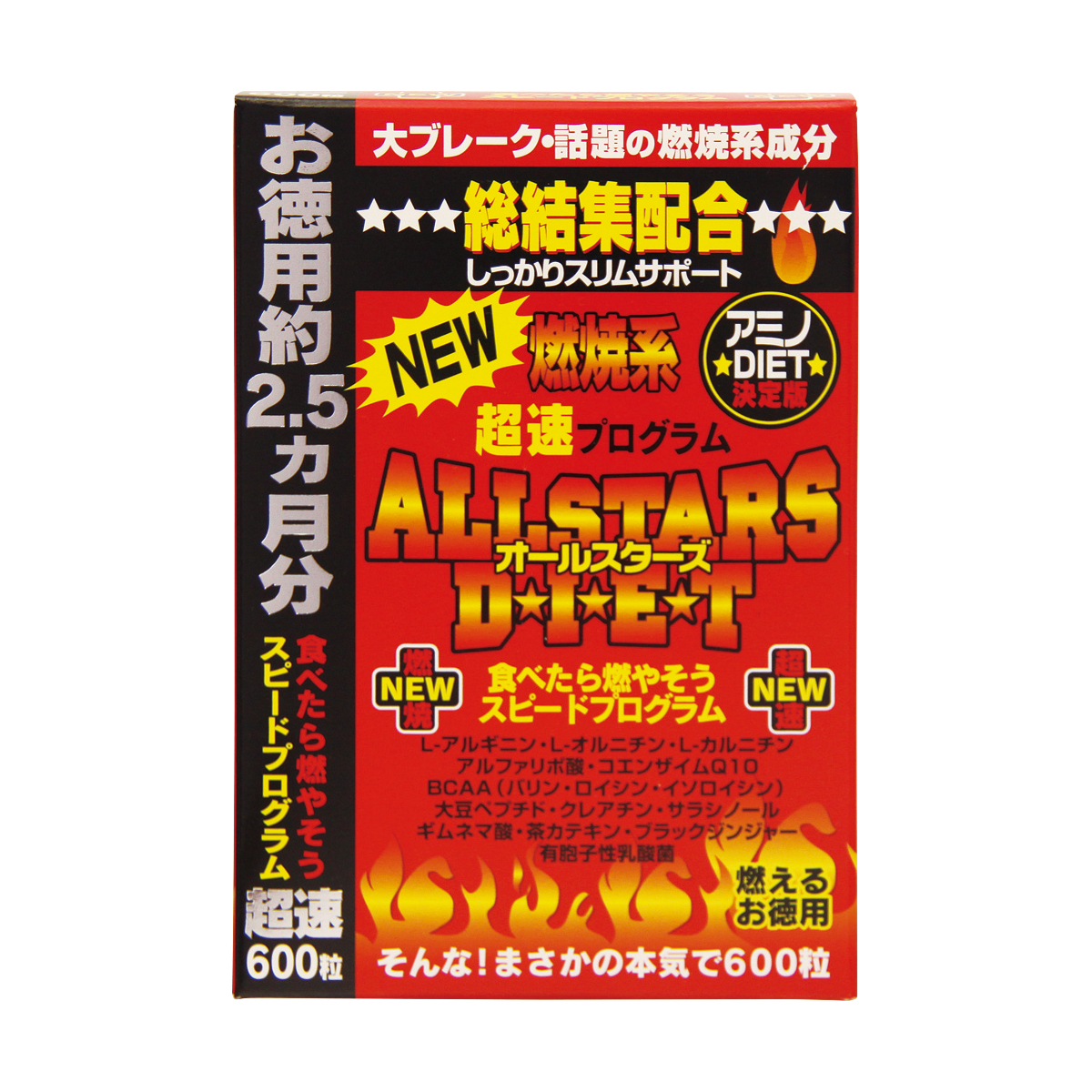 | 乳糖(アメリカ製造)、サラシア、L-オルニチン塩酸塩、L-カルニチン酒石酸塩、クレアチン、大豆ペプチド、ギムネマシルベスタ、ブラックジンジャー、アルファリポ酸、緑茶エキス、有胞子性乳酸菌、コエンザイムQ10/結晶セルロース、L-アルギニン、ステアリン酸カルシウム、微粒二酸化ケイ素、ビタミンC、イソロイシン、バリン、ロイシン、ニコチン酸アミド、ビタミンE、パントテン酸カルシウム、ビタミンB1、ビタミンB6、ビタミンA、葉酸、ビタミンD3、ビタミンB-12(一部に乳成分、大豆を含む) |