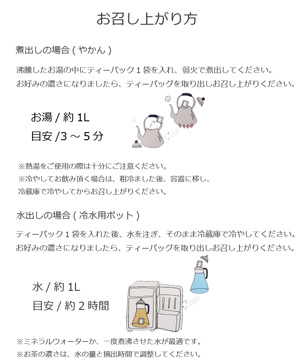 ・ティーバッグ1袋入れた後、水を注ぎ、そのまま冷蔵庫で冷やしてください。お好みの濃さになりましたら、ティーバッグを取り出してお召し上がりください。