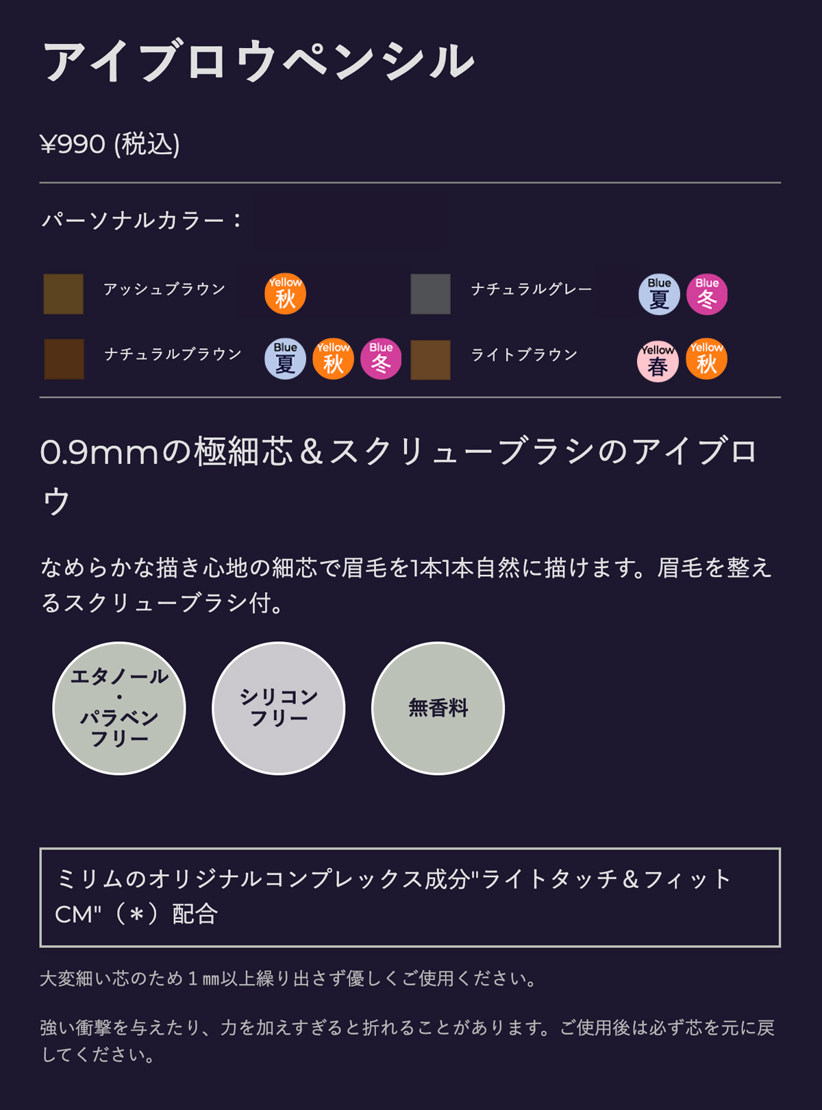 | ●お肌に異常が生じていないかよく注意して使用してください。化粧品がお肌に合わないとき、即ち次のような場合には、使用を中止してください。そのまま化粧品類の使用を続けますと、症状を悪化させることがありますので、皮膚科専門医等にご相談されることをおすすめします。〈1〉使用中、赤味、はれ、かゆみ、刺激、色抜け(白斑等)や黒ずみ等の異常があらわれた場合。〈2〉使用したお肌に、直射日光があたって上記のような異常があらわれた場合 ●傷やはれもの、しっしん等、異常のある部位にはお使いにならないでください。 ●目に入らないようにご注意ください。目に入ったときは、水またはぬるま湯で直ちに洗い流してください。 ●乳幼児の手の届かないところに保管してください。 ●高温または低温、直射日光のあたる場所には保管しないでください。 ●アイブロウ以外の用途に使用しないでください。 ●長時間保管後、または過酷温度下で表面が白くなる場合がありますが、品質上、問題ありません。 |