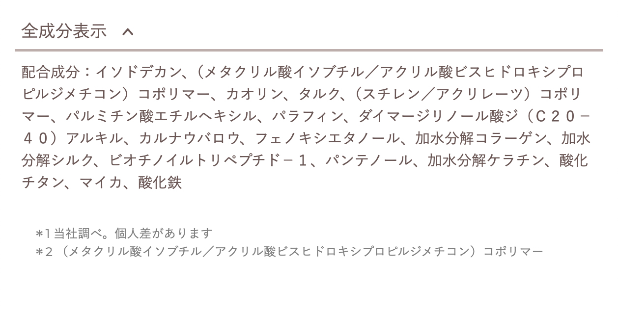 | イソドデカン、(メタクリル酸イソブチル/アクリル酸ビスヒドロキシプロピルジメチコン)コポリマー、カオリン、タルク、(スチレン/アクリレーツ)コポリマー、パルミチン酸エチルヘキシル、パラフィン、ダイマージリノール酸ジ(C20−40)アルキル、カルナウバロウ、フェノキシエタノール、加水分解コラーゲン、加水分解シルク、ビオチノイルトリペプチド−1、パンテノール、加水分解ケラチン、酸化チタン、マイカ、酸化鉄 |