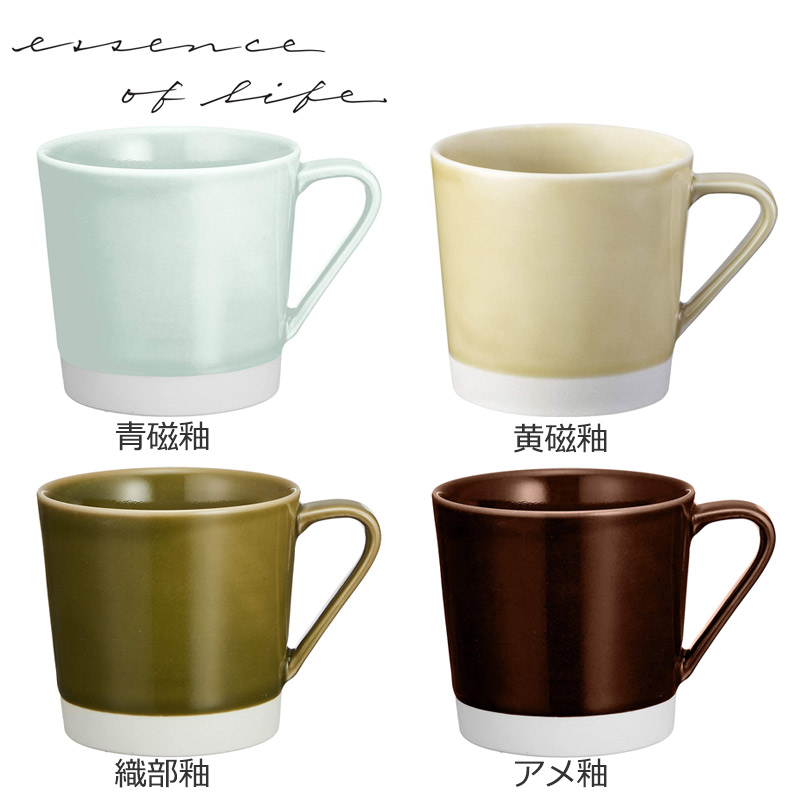 その波佐見焼の永尾郷の地で昭和10年から続く永泉窯が創り出す青磁釉、黄磁釉、織部釉、アメ釉のアースカラー4色のマグカップ。