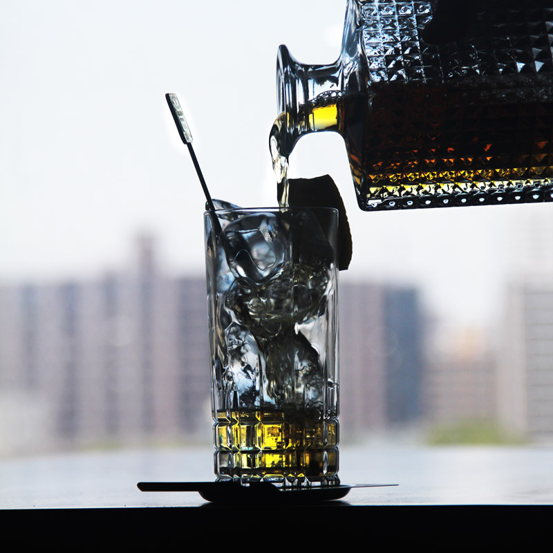 口部から底面までデコレーションされているクリスタルガラスのグラスにドリンクを注ぐと、圧倒的な透明度ど屈折率によってドリンクの色が光に透かされて輝きを放ち始めます。