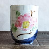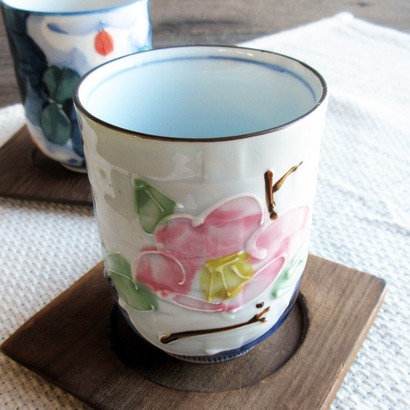ゴスの下地に、ピンク色の椿の花が描かれている湯飲みです。