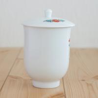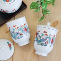 色鮮やかで繊細な花鳥絵が華やかな蓋付き湯呑です。