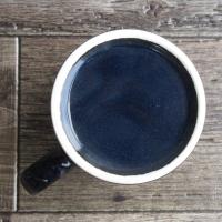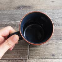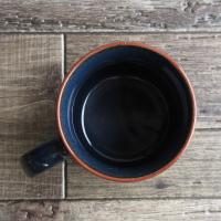 まるでデニムのような、深いネイビーにブラウンのラインが入ったマグカップです。