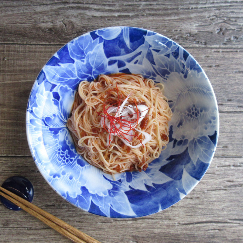 器の内側いっぱいに青い花模様が描かれている麺丼です。