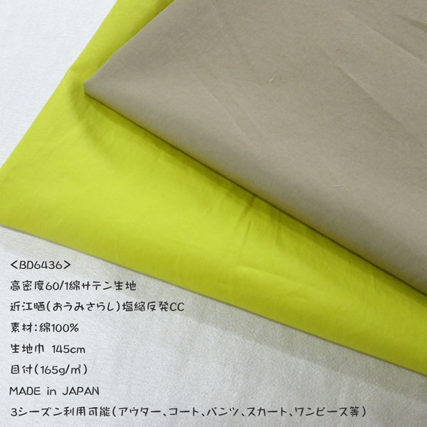 【高級綿素材】綿100%高密度60/1サテン生地(BD6436)無地/近江晒+塩縮+反発CC 生地巾145cm巾 数量1(50cm)350円 MADE in JAPAN