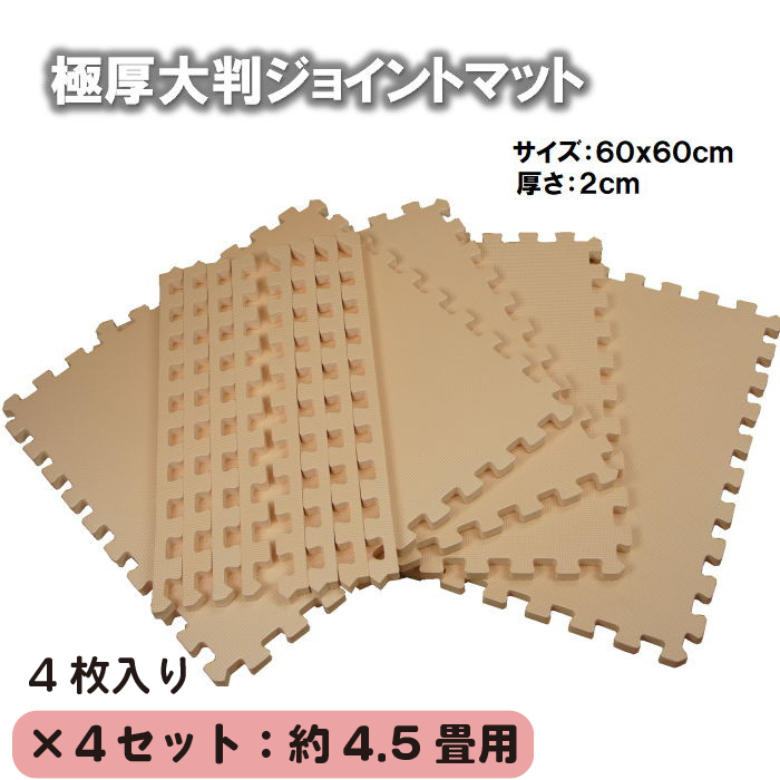 極厚大判ジョイントマット ベージュ色 4枚(約60x60x2cm/枚)x4セット 4.5畳用(16枚) 洗えるパズルマット 衝撃吸収 サイドパーツ付