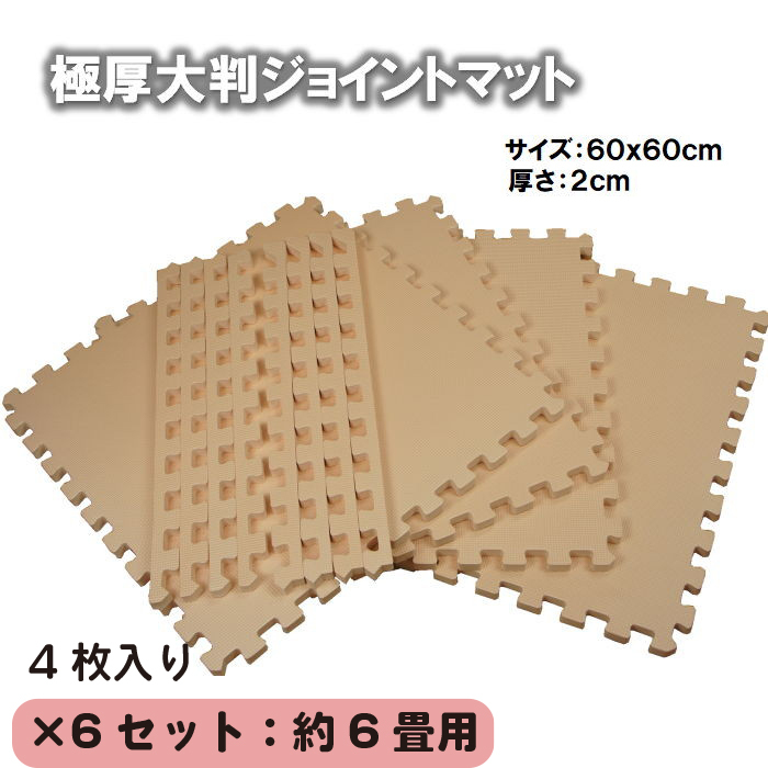 極厚大判ジョイントマット ベージュ色 4枚(約60x60x2cm/枚)x6セット 6畳用(24枚) 洗えるパズルマット 衝撃吸収 サイドパーツ付